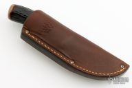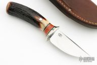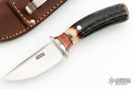 This Pocket Knife by Jim Behring features a satin finished upswept convex ground blade with .147" blade stock and .929" blade depth, hidden tang construction. The handle features a nickel silver guard and mammoth ivory butt plate, black/yellow/red spacer pattern, and premium vintage pinned Sambar stag grip. Great look and feel. Comes with full stitch brown leather sheath with pocket clip. Excellent condition. Comes with a zippered case.