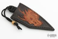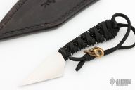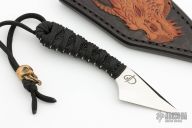 This Kiridashi by Denis Mura features a chisel ground mirror polished blade with hand rub satin finished flats, .122" blade stock and .967" blade depth, hidden tang construction. The handle has rayskin under red cord wrap. Has lanyard with bead. Comes with a hand tooled leather sheath by Kiara. Excellent condition.