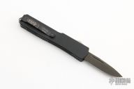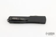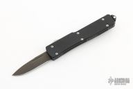 This California Legal UTX-70 features a 1.75" black blade with fullers. The handle is comprised of black anodized aluminum handle with blasted stainless steel hardware, thumb slide and tip down pocket clip. Dated 6/2007 with a S/N of 02184. Comes with original box, sheath and papers. Has a few scuffs, otherwise excellent condition.