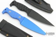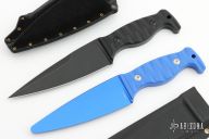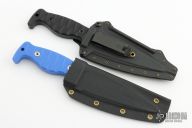 Has a black stonewashed blade with .191" blade stock and 1.461" blade depth, full tang construction with black G-10 scales. Comes with ambidextrous kydex sheath with velcro loops on one side and a metal clip on the other. The sheath also holds a fire steel in the sheath. Comes with matching trainer and sheath, original box and COA. Excellent condition.