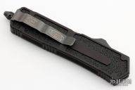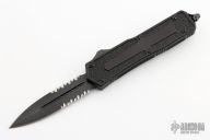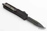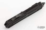 This Scarab OTF auto by Microtech has a black blade with fullers. The handle is black aluminum with all black fittings, single glass breaker, tip down black stainless steel clip. #05239. Includes original sheath, paperwork, and box. Excellent Condition.