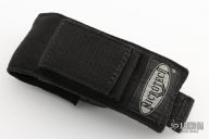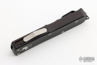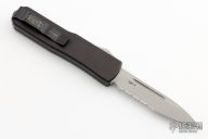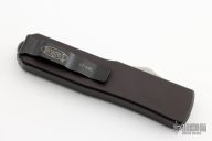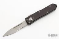 This UTX-85 by Microtech features a drop point bead blasted blade with partial serrations. The handle has a smooth black aluminum frame with black hardware and tip down clip. Comes with original box and papers. Dated 12/2008 and S/N 00363.  Includes the original box. Excellent Condition.