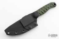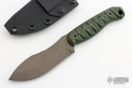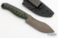 This Knife by Half Face Blades features a cerakoted blade with a notched thumbrest, .119" blade stock, 1.250" blade depth, full tang construction.  The handle has green/black carbon fiber scales.  Comes with a kydex sheath with clip. Includes original box and papers.  Excellent Condition.