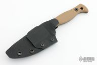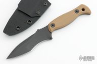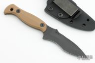 This Extremis MK1 by Half Face Blades features a black blade with a notched thumbrest, .144" blade stock, .994" blade depth, full tang construction.  The handle has tan G-10 scales.  Comes with a kydex sheath with clip, and original box and papers. Excellent condition.
