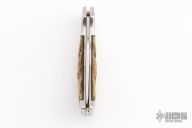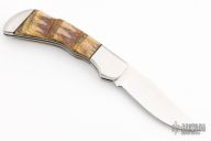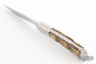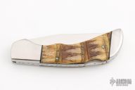 This lockback by Tommy Ware features a satin finished blade with a nail nick. The handle has satin finished stainless steel bolsters and liners, Armadillo skin scales with black liners, fileworked stainless steel backspacer. Comes with a zippered case. Dated 2001. Has some light scratches, otherwise excellent condition.