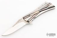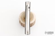 This Closer by Koji Hara features a mirror polished blade with bamboo motif carved flats and a notched flipper. The handle has a bamboo motif carved stainless steel scales and backspacer, jeweled stainless liner and black lip pearl inlays. Nice detent, lockup and blade seating. Comes with a button case. Excellent condition.