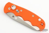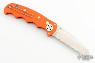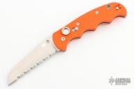 This Spyderco Autonomy features a satin finished fully serrated blade, H-1 Blade steel. The handle has orange G-10 scales, stainless steel liners, and a tip up reversible clip. Excellent condition. Factory Second
