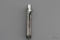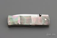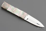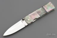 This linerlock folder by Koji Hara features a mirror polished blade with false top edge and a black lip pearl inlaid thumb stud. The handle has black lip pearl scales with nickel silver spacers and liners, stainless steel locking liner, stainless steel backspacer. Solid lockup and detent. Comes with a zipper case. Excellent condition.