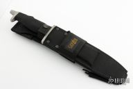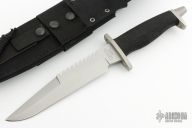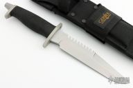 Hard to find sawtooth BMF by Gerber has been out of production for many years. Blade is bead blasted as are the guard and butt cap. .246" thick and 1.482" deep. Non-skid handle. Comes with original sheath and box. Excellent condition. Highly desirable tactical knife. #001347. Has original Silva compass and diamond sharpening stone.