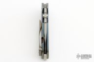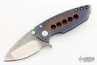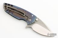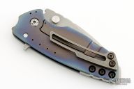 This Hyper 90 from Direware Custom Knives features a two-tone blade with satin finished grinds and tumbled flats, notched thumb rest, flipper and dual thumb studs. The handle is comprised of a flamed bead blast finish titanium frame, textured clip and satin backbar. Comes with original box. Excellent condition.