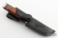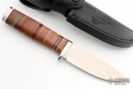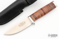 This Idun by Fallkniven features a satin finished VG10 laminated steel blade in convex grind and hidden tang construction. Blade is .184" thick and 1.185" deep. The handle has a stainless steel guard, stacked leather handle with black, red, and white spacers, and an aluminum butt cap. Comes with black leather sheath. Excellent condition.