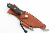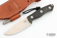This Knife by Bark River Knives features a satin finished blade with .210" blade stock and 1.246" blade depth, full tang construction. The handle has black canvas micarta scales.. Comes with a brown leather sheath. Excellent condition.