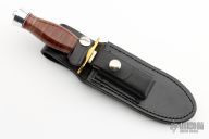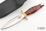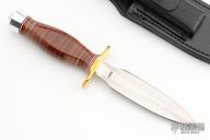 This Dagger by Martin Knives features a satin finished double edged blade, .209" blade stock and 1.110" blade depth, hidden tang construction. The handle has a brass guard, stacked leather grip with red/white/black spacers and an aluminum butt. Comes with black leather sheath. #07 on choil and back of sheath. Excellent condition.