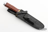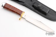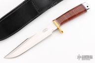 This Hunter by Martin Knives features a satin finished blade with sharpened top edge, .216" blade stock and 1.232" blade depth, hidden tang construction. The handle has a brass guard, stacked leather grip with red/white/black spacers and an aluminum butt with lanyard hole. Comes with black leather sheath. #07 on choil and back of sheath. Excellent condition.