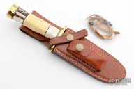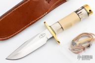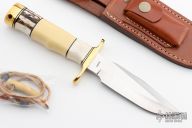 This Hunter by Martin Knives features a satin finished blade with sharpened top edge, .221" blade stock and 1.251" blade depth, hidden tang construction. The handle has a brass guard, stag and ivory paper micarta grip with brass/black spacers and a brass butt with lanyard hole. Comes with brown leather sheath. #07 on choil and back of sheath. Excellent condition.