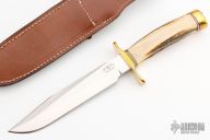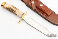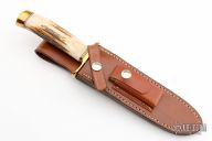 This Fighter by Martin Knives features a satin finished blade with sharpened top edge, .217" blade stock and 1.228" blade depth, hidden tang construction. The handle has a brass guard, stag grip with brass/black spacers and a brass butt. Comes with brown leather sheath. #07 on choil and back of sheath. Excellent condition.