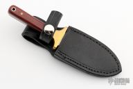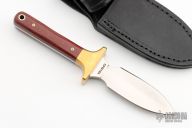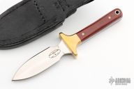 This Dagger by Martin Knives features a satin finished double edged blade, .130" blade stock and 1.007" blade depth, full tang construction. The handle has brass bolsters, red linen micarta scales with mosaic pins and lanyard hole. Comes with black leather sheath. #07 on back of sheath. Excellent condition.