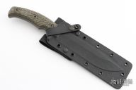 The full-tang handle features super durable and grippy 3D contoured G10 handle scales. G-10 is a superior handle material compared to the old stacked leather handles or Bakelite style of yesteryear. The G10 material provides a sure grip in any weather or climate condition. A Kydex scabbard is included with two MAD straps for belt or pack carry.