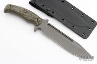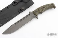 The knife is 12" in total length with a 7" blade made from 80CRV2 Carbon Steel. The 1/4" thick, oversized stock used for this knife is tough enough to handle anything you can throw at it. A long, deep fuller profile provides strength as well as a reduced surface area for deeper penetration. The clip point design is ideal for puncturing, and the curved blade allows for better surface area on cuts as well. The knife is finished with a Tungsten Cerakote finish for added corrosion resistance and durability, while providing a low visibility look.