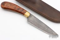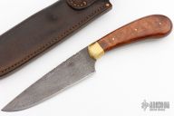 This knife by Dean A Hazuka features an antique finished blade with fileworked thumbrest, .117" blade stock and 1.420" blade depth, full tang construction. The handle has brass bolsters, maple scales with brass pins. Comes with a brown leather sheath with copper pins. Excellent condition.