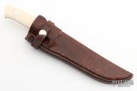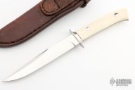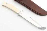This Fighter by George Herron features a mirror polished blade with a sharpened top edge, .209" blade thickness and .996" blade depth, full tapered tang construction. The handle has a stainless steel guard and mammoth ivory scales with black liners. Comes with original leather sheath. #1230. Has a small chip in the butt of the knife, otherwise excellent condition.