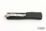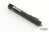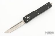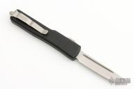 This UTX-70 OTF automatic features a stonewash finish tanto blade with a standard edge. Black aluminum frame with Stainless steel clip. Dated05/2020 and serial number10981. Has some scuffs, otherwise excellent condition.