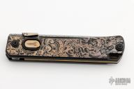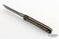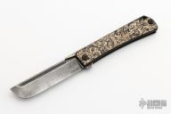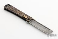 Darriel Caston is D Rocket Designs. "Makers such as Timothy Wright, Terry Davis, Terry Lee Renner, Ron Lake, Jim Corrado and James Whitehead took me under their wings and I believe their skill and attention to detail shows in my work. I have one several awards – Best New Maker at the Oregon Knife Show and the Bay Area Knife Show. I kept my style as it is now – Balance and Zen. Through 2004 to 2013 I left to scene to raise my children. Since 2013 I came back to Design and Knifemaking with a vengeance – literally! I had something to prove. Everything under the sun has been seen before. We only put our own spin on it. I came back not only to put my stamp on things, but to educate, mentor and create a honorable business that stands the test of time. I put time into deciphering old techniques to marry them with cutting edge technology. Lost Wax with 3D Printing – Japanese Patina Techniques with Modern Chemical Processes – Old Designs with the twist of the Future."