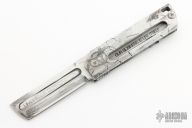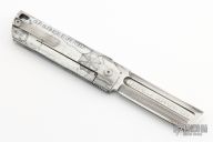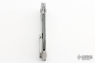 The MaximX (SpaceXi) Flipper version 1 is the LARGE brother of the SpaceX. The MaximX is the second version of the SpaceX that runs on bearings that allows it to almost fly open. Its complexity is in its simplicity. It is sleek and simple, but with a complex 6 face grind with fullers. It is a modern take on your grandfather’s pocketknife. It is a pleasure to hold and use. The Blade is VG-10 high grade knife steel and the handles are titanium. Comes with original box. Excellent condition.