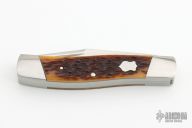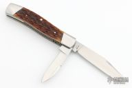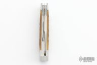 This Texas Jack by Stanley Buzek was made for the 2023 Waterville Custom Collection. It features hand rub satin finished blades with nail nicks. The handle has 416 stainless steel bolsters with integral liners, liners have jeweled interiors, Shetland jigged Bourbon Bone covers, stainless steel Federal Shield escutcheon, CPM154 stainless steel springs. Has half-stop, flush in all positions. Comes with a zippered case. New from maker at the 2023 Blade Show Texas.