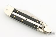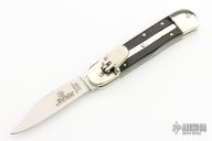 This leverlock auto by Hubertus features a mirror polished drop point blade, nickel silver double bolsters, ebony scales, and brass liners and pins. Opens with a nice snap. Very fast opening. Comes with original box. New condition.