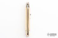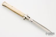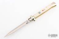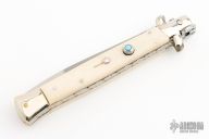 This swivel bolster auto by Latama features a polished dagger ground blade with a false top edge and fileworked spine. Nickle silver guard and rear bolster and White Bone scales, fileworked brass liners, fileworked stainless steel backspacer. Has a turquoise inset in push button. Nice function, strong firing and lock up. Excellent condition.
