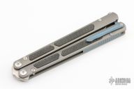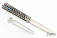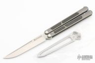 This Balisong by Maxace Knives features a satin finished clip point blade with false top edge. The handle has blasted titanium handles with carbon fiber inlays, anodized titanium backspacers, tip up clip and T-latch. Comes with original box, zippered case with trainer blade and extra hardware. New from maker.