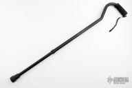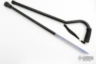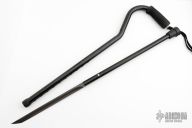 This Defensive Sword Cane by Warren Thomas features a spear point chisel ground fingerprint anodized titanium blade with carbon fiber laminate, .234" blade stock and .736" blade depth, hidden tang construction. The handle is a normal looking cane. Excellent condition. The cane can be as long as 37.5" down to 33.5"