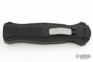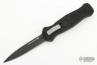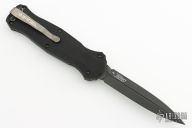 "Introducing an OTF like none-other.. The new Infidel® is rapidly making believers out of many a skeptic. Built for strength and reliability the patent pending double-action mechanics get it done over the long haul. Grab on and you will find the handle grip rock-solid with its patented machined in Presidio® style bi-directional tread pattern, and overall generous sizing for gloved hands. Intuitively pressure the release-slide forward and its spear-point edged steel fires and locks up with a unique three-point retention system with amazingly negligible blade play. Reverse the process and the blade retracts in a rapid blur of motion. The Benchmade Infidel is a special operator’s fantasy come true."  Includes original sheath and papers. Excellent condition.