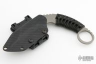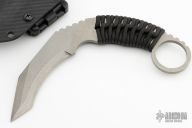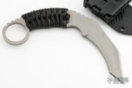This Spartan Karambit by Schwartz Tactical features a double-edged tanto titanium blade with carbidized edges, .184" blade stock and .880" blade depth, full tang construction with black paracord wrap. Comes with kydex sheath. Has a couple sheath marks, otherwise excellent condition.