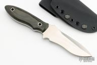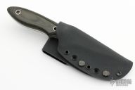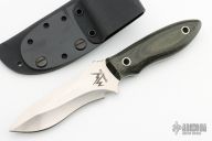 This Orion from Mercworx features a hand rub satin finish blade with false top edge and notched thumb ramp, .178" blade stock and .973" blade depth. The handle is comprised of black/green canvas micarta scales over full tang construction with hollow pins. Includes a kydex sheath. Excellent condition.