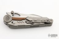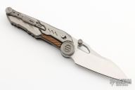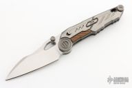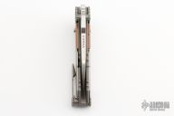 This knife has a satin finished blade with dual thumbstuds, notched thumbrest and a thumbhole. The handle has a titanium frame with titanium and copper overlays. Nice detent, lockup and blade seating. Has a safety to lock the blade open. Nice detent, lockup and blade seating. Comes with original case. New from maker.