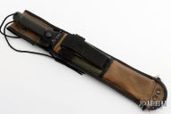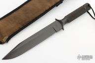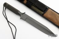 This Jereboam MK II from Chris Reeve is similar to the Shadow series and was made for special forces use. The entire knife was made from a single solid billet of steel. Black coated blade with false top edge. .263" Blade Stock 1.415" Blade Depth. Comes with a nylon sheath, not original. Hardness at between 55 and 57 Rockwell C is not brittle but gives good edge retention along with ease of sharpening. Removable butt cap with storage area in handle. A very nice tactical fixed blade. Has some light scuffs/scratches, otherwise excellent condition.