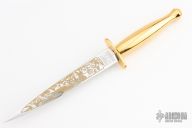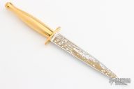 This USMC Marine Raider Stiletto by HG Long & Co and EK Knives features a double edged blade with a depiction of the Battle for Okinawa, .180" blade stock and .934" blade depth, hidden tang construction. The handle has a gold plated guard and grip. Comes with original box and papers. Excellent condition. #514 of 2500