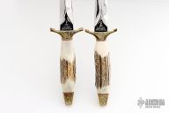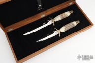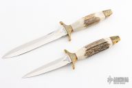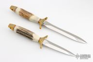 This Presidents Collection from Gerber features two knives, a Mark I and Mark II dagger in the same configuration. They feature polished double edged blades, engraved brass guards and pommels with sambar stag handles over hidden tang construction. Numbered 0281on ricasso. Includes wooden display case. Excellent condition.