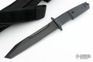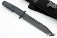 This Fulcrum has a Testudo coated N690 stainless steel partially serrated tanto blade with hidden tang, notched thumb rest and double guard. Blade width is .246", depth is 1.29". Handle is Forprene non-slip with exposed tang/glass breaker and lanyard hole. Comes with nylon sheath. Has some scuffs and scratches, otherwise excellent condition.