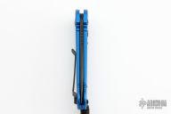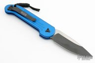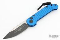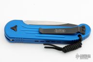 This LUDT side opening automatic by Microtech has a black finished blade with a standard edge and a contoured blue aluminum frame. Stainless steel clip. Dated 05/2023 and serial number 32130. Comes with original box and papers. New condition.
