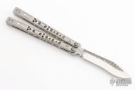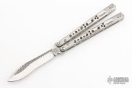 This Balisong by Palethius Designs features a hand rub satin finished blade with carved flats. The handles are milled and carved titanium with matching spacers. Comes with original box, black leather sheath and papers. Has a few light scuffs, otherwise excellent condition.