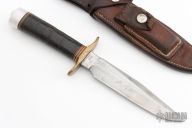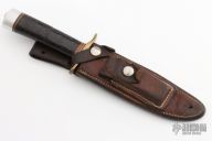 The Model 1-6 features a satin finished blade with a sharpened top edge (well, it was sharp at some point), .206" blade stock and 1.103" blade depth, hidden tang construction. The handle has a brass guard, stacked leather grip with red/white/blue spacers, and a duralumin butt cap. Has scratches and patina, the handle is a little bit loose, solder joint is rough, fair condition for its age. Definitely a Theatre item, and WAS used! Comes with a brown leather Randall sheath, it is missing the stone.