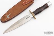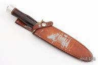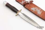 The Model 2-7 Randall has a satin finished double edged blade with .211" blade stock and 1.258" blade depth, hidden tang construction. The handle has a brass guard, stacked leather grip with red/white/blue spacers, and a duralumin butt cap. Has scratches and patina, looks like the butt cap may have been replaced/repaired at some point. Comes with a brown leather Randall sheath, it is missing the stone pouch, it has duct tape residue on the sheath, it is not the original sheath.