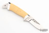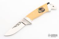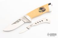 This Kangaroo knife set by Lorenzo Hendricks features a mirror finished blade with floral etching, .184" blade stock and 1.100" blade depth, full tang construction. The handle has stainless steel dovetail bolsters, yellow paper micarta scales with scrimshaw by the maker. Knife includes a second blade that fits nicely in rear of handle. Second blade has a hand rub satin finished tang and mirror polished blade. This set is numbered "107" on both blades. Excellent condition. Comes with a zippered case