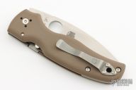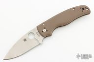The new BladeOps Exclusive Spyderco Shaman features a brown G-10 handle, skeletonized stainless steel liners, a satin finshed leaf shaped CPM 15V blade, and Spyderco's trademark round hole opening feature.