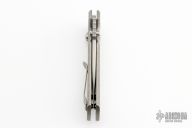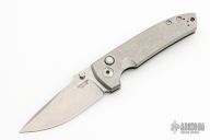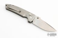 This Project VECP Buttonlock from Les George features a stonewashed CNC flat ground blade and a tumble finish titanium frame. Tip up titanium clip. Phosphorus bronze washers. Smooth action. Nice blade seating, detent and lockup. Excellent condition. Comes with a zippered case.