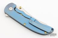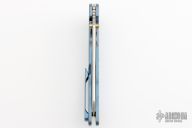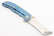This Norseman (#1405) by John Grimsmo features a tumbled blade with a single anodized titanium thumb stud, notched thumb ramp and flipper. Stonewashed and anodized titanium frame with a honeycomb pattern front scale and titanium screws. Matching tip up pocket clip.  Very smooth action that requires no wrist movement. Nice detent, lockup and blade seating. Rides on ceramic bearings. Comes with original box, extra thumbstud, and COA dated AUG 22, 2018. Excellent condition.