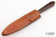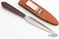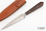 This Dagger from Don Fogg features a satin finished double edged blade with forge finish flats, .265" blade stock and .964" blade depth, full tang construction. The handle is comprised of dark wood scales with brass pins. Comes with a brown leather sheath. Has been resharpened, has scratches, otherwise good condition.